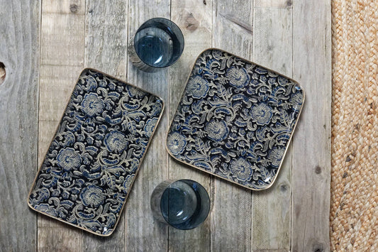 Plateau métal émaillé Zellige bleu 16x16, bordure dorée