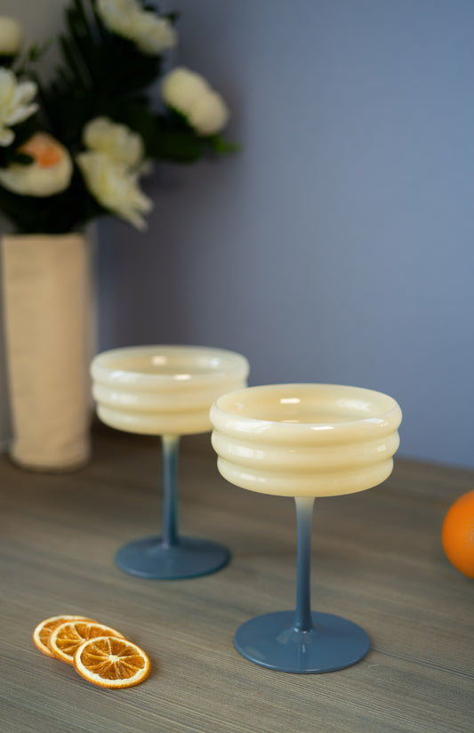 Set de 2 verres à champagne en verre. Blanc et bleu