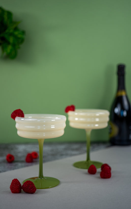 Set de 2 verres à champagne en verre. Blanc et vert.
