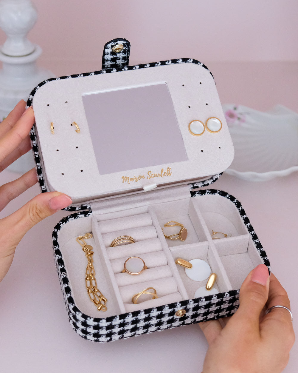 Boîte à bijoux de voyage Brigitte effet lin - pied de poule noir