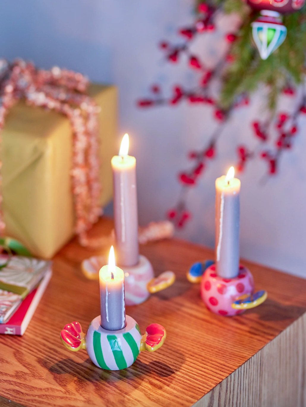 Le bougeoir CARAMELLA de Bloomingville apporte une touche ludique et colorée à votre décoration intérieure. L'ensemble comprend trois bougeoirs, chacun avec un design unique peint à la main dans des couleurs fraîches et vives. Ces bougeoirs créent une ambiance chaleureuse et accueillante, ce qui les rend idéaux aussi bien pour un usage quotidien que pour des occasions spéciales