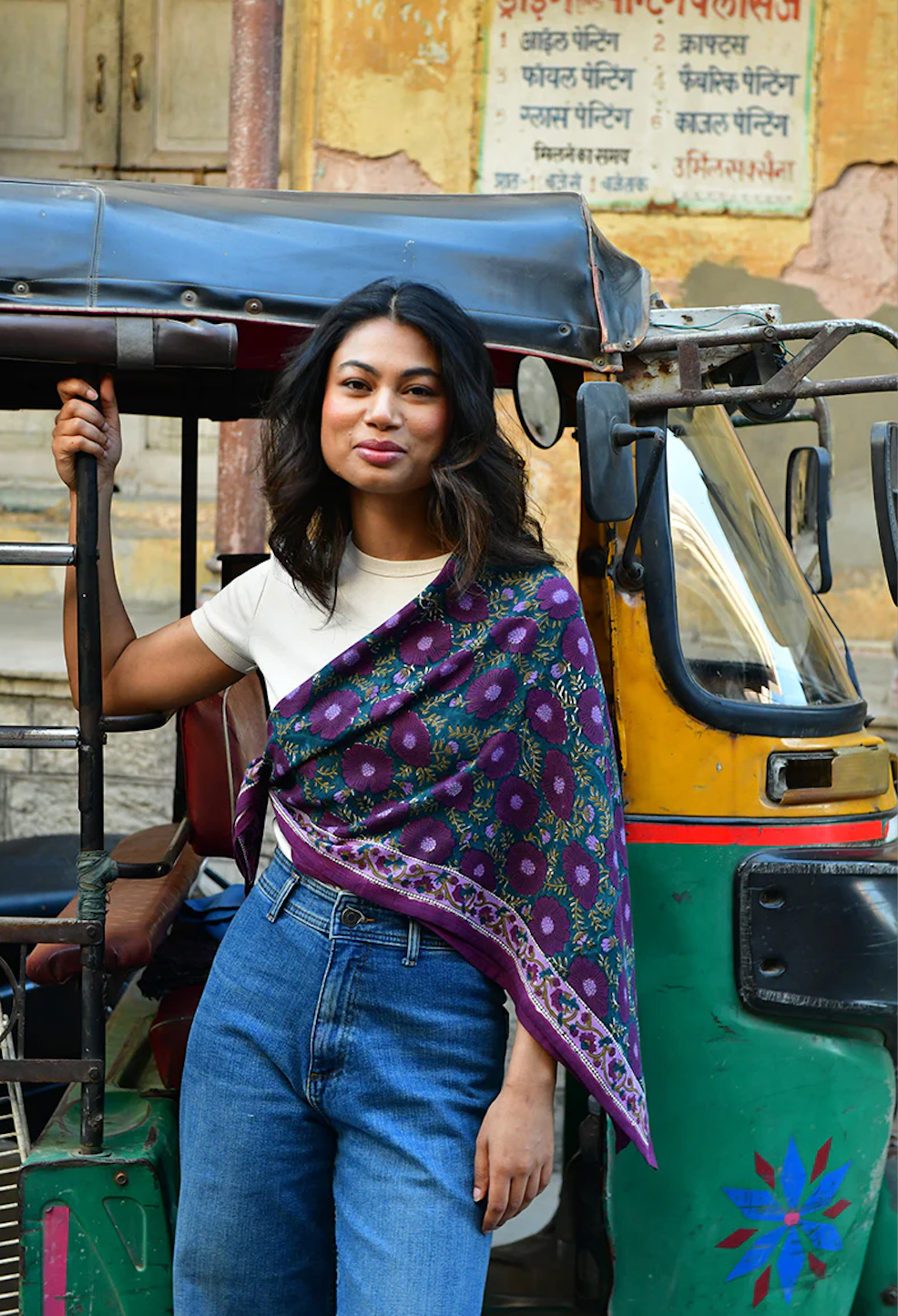 Foulard imprimé artisanalement dans un atelier du nord de l'Inde, au Rajasthan.