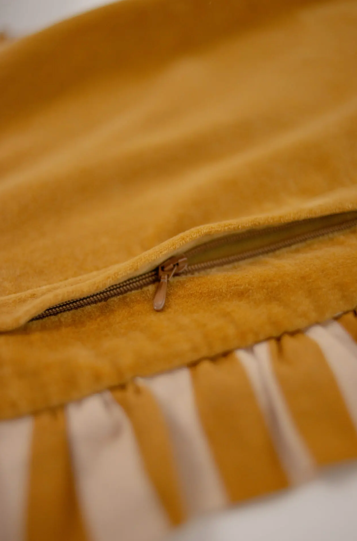 Housse de coussin 100% coton, ornée d'un charmant volant rayé qui ajoute une touche ludique.