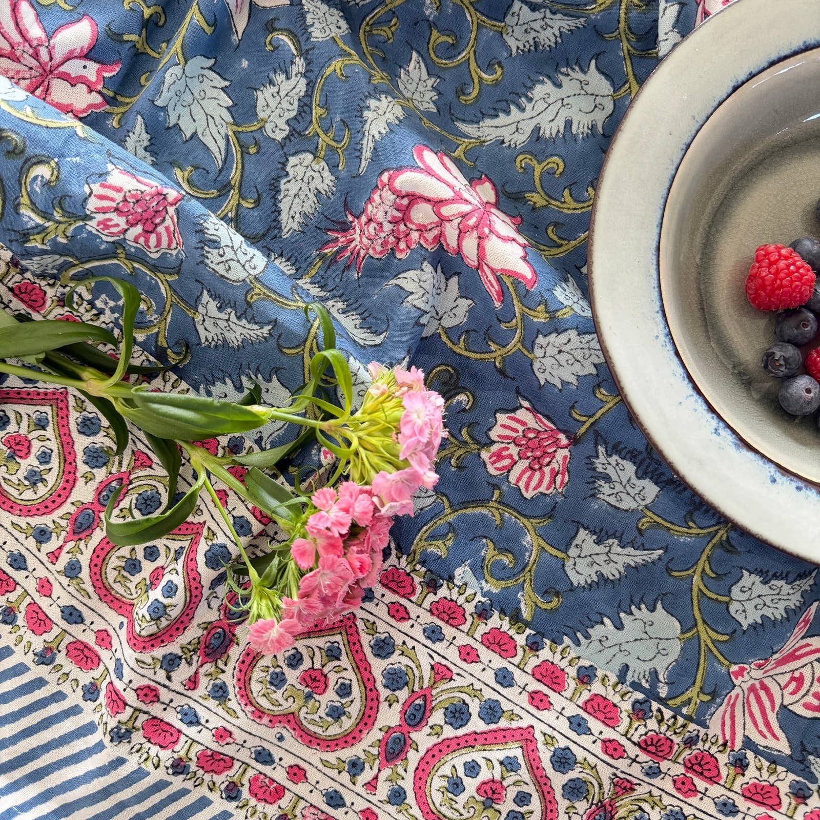 Magnifique nappe imprimée au tampon de bois ( blockprint) remarquable par sa double bordure de coeurs et rayures qui vient souligner le très bel imprimé floral sur un fond bleu pervenche. Elle apportera un vent de fraîcheur dans la deco pour le printemps ! Nappe réalisée dans notre atelier familial à Jaipur. Le procédé traditionnel d'impression au tampon de bois, qui existe depuis des siècles permet de créer de magnifiques imprimés où chaque couleur est appliquée séparément grâce à des blocs de bois gravés minutieusement. Les artisans qui perpétuent cet artisanat séculaire sont de véritables artistes ! Nous utilisons pour nos nappes une toile de coton très qualitative, qui apporte un très joli tombé et résiste aux lavages fréquents.