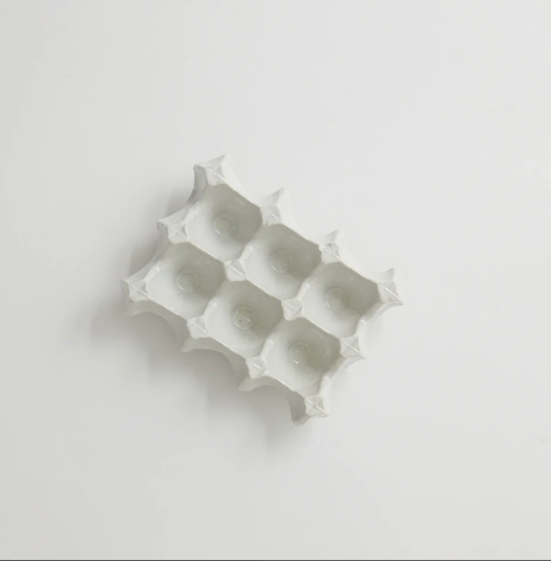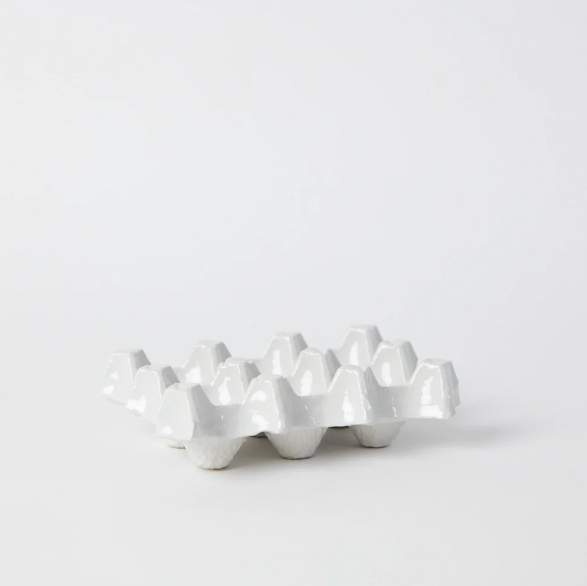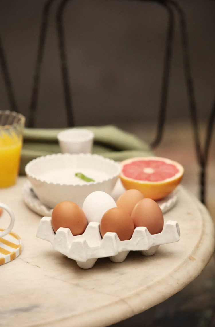 Plat à œufs en grès émaillé blanc. Un rangement parfait et un joli détail sur la table du petit-déjeuner ou le comptoir de la cuisine.