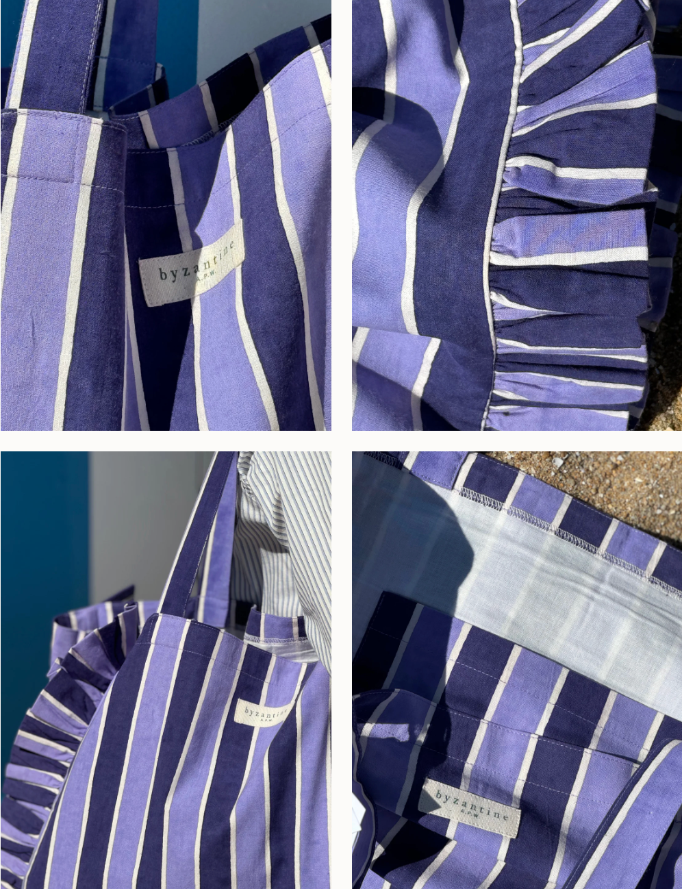 Ce fourre-tout audacieux conjugue style et praticité avec ses volants signature qui captent l'attention. Spacieux et polyvalent, il épouse vos journées—du marché aux escapades côtières. Doublé d'une poche intérieure et équipé d'anses généreuses de 60 cm, il se porte sans effort. Disponible en deux coloris graphiques : rayé lavande et damier moutarde violet. 100 % coton. Dimensions : 45 × 37 × 15 cm.